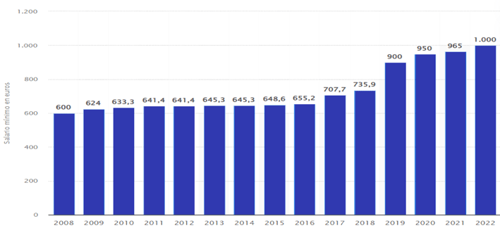 Se pasa así a un incremento del 3,63% respecto al SMI fijado en 2021, establecido en 965 €/mes en 14 pagas (13.510€ anuales). El incremento acordado por el Gobierno hace que la retribución mínima que ha de percibir un trabajador que preste servicios a tiempo completo sea de 1.000 €/mes en 14 pagas (14.000€ anuales).